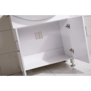 Този ПВЦ шкаф за баня е с 2 врати с плавен механизъм за затваряне и порцеланов умивалник. Той е напълно влаго- и водоустойчив.