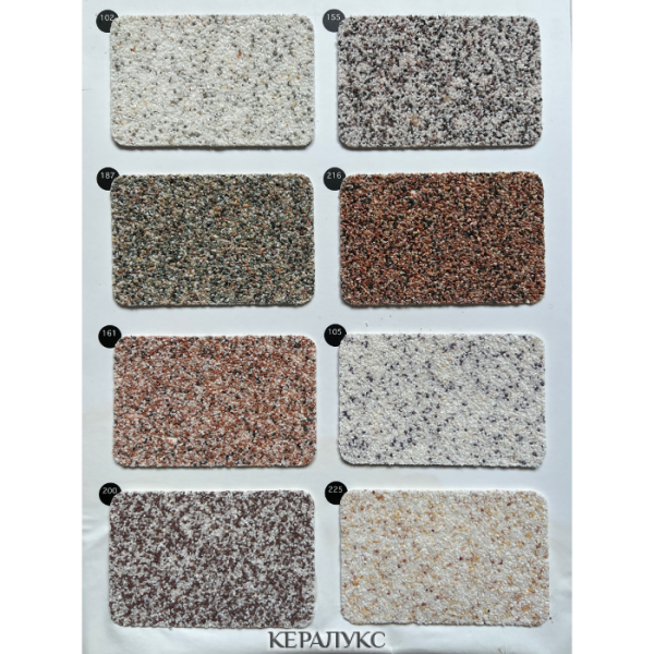 ОПИСАНИЕ: Издръжлив декоративен материал за външно покритие на основата на акрилно съполимерно свързващо вещество и гранит мрамор.