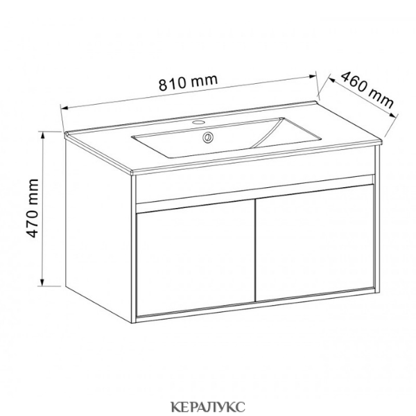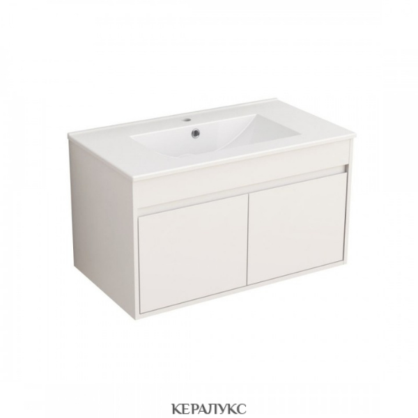 Влагоустойчив шкаф за баня с бяла керамична мивка и две вратички.