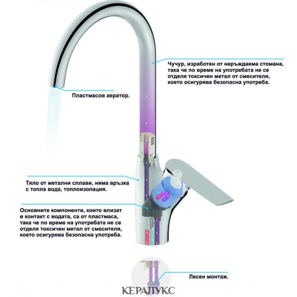 Смесител ДАНИСТА е предвиден за стоящ монтаж на кухненска мивка. Той е с една ръкохватка за лесно регулиране на топлата и студена вода. Има керамичен затварящ механизъм, който предотвратява капене и протичане на вода.